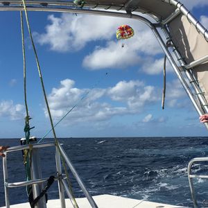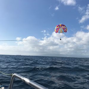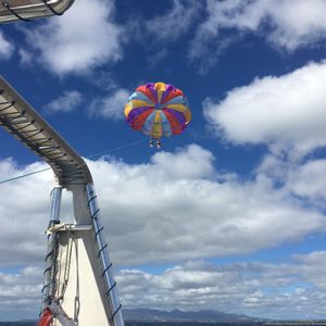 初めてパラセーリングに参加しました。日本のカップルの方と外国人のファミリー2組が参加されたツアーでしたが、船で沖合いに出る際も言葉はわかりませんが楽しもう‼️みたいな雰囲気でとても心地よかった。オアフ島を海の上から独り占め出来る絶景はヤバイです!