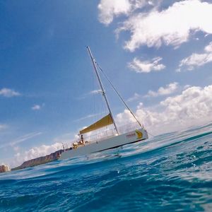 家族で参加。妻と子は2日前に別のツアーでシュノーケリングを初めて体験し楽しかったのでVeltraで捜しセーリングもシュノーケリングも両方楽しめるこのツアーに決めました。私は英語は出来ませんが他の方の書いた体験談を理解しておけば何とかなると思います。ビーチの受付の女性の英語も乗船してからのクルーの英語も100%聴き取れませんでしたが親切に対応してくれます。海に潜ると海亀が4匹悠々と泳ぎ、魚も縞模様のものや黄色のもの等熱帯魚も近くで見れました。海から上がって来てからのセーリングも天気も風も良く気持ち良かったです。妻と子はシュノーケリングの基本を別のツアーで習っていたので良かったのですが丸っきり初めてでブッツケ本番ですとキツイかもしれません、ネットなどで調べて理解してから参加した方が良いと思います。コスパも良いしワイキキ集合で時間の無駄も無いこのツアーは次も参加すると思います。