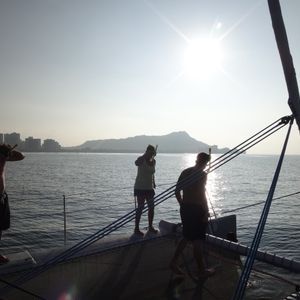 There is an area offshore where you can see schools of fish and green sea turtles, and many participants enjoy snorkeling there until they get bored and return to the boat (about 30 minutes). Life jackets are not provided during the ride. For concerns about buoyancy while snorkeling, soft foam noodles are available for use. Once everyone is back on the boat, drink orders are taken, and then you sail around Diamond Head until it's time to return. During this time, you might encounter dolphins or get soaked by big waves.