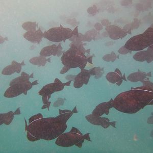 ビーチ沖合に、魚とアオウミガメの群生エリアがあって、そこで、多くの参加者がシュノーケリングを飽きて船にもどるまで(30分くらいか)堪能させてくれる。