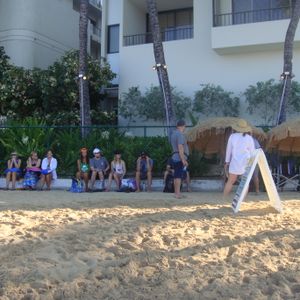 アウトリガー・リーフオンザビーチの前の浜で受付・船の発着・ビーチサンダルの預かり、記念写真撮影(15$)をする。