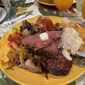 This was my first experience in Hawaii. The food was a buffet with a variety of Hawaiian dishes, and there were even desserts. There was also a performance during the meal, which was fantastic.