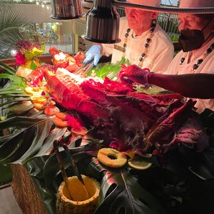 The meal included delicious options like pork, roast beef, and was very filling! It was great that we could enjoy a variety of meats, fish, and vegetables. The juice was also tasty! During the meal, we were able to watch an aloha dance, and the music created a wonderful atmosphere while we ate! The show featured a whirlwind of dances to various songs, allowing us to really feel the essence of Hawaii, and I was extremely satisfied! It was especially exciting when songs I knew played, which doubled the fun!