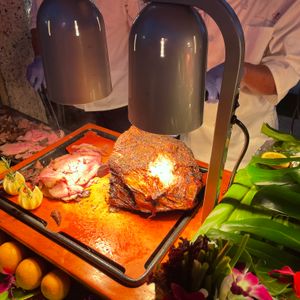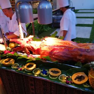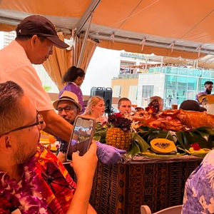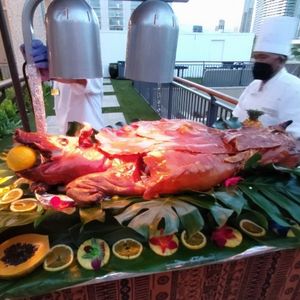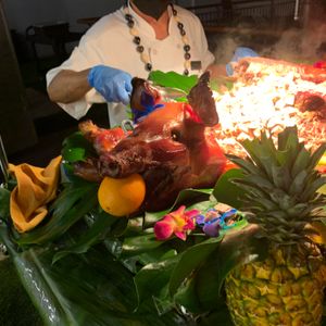 Our first impression was great. The setup under the large tents and the decor and dishware were all very nice. The staff were very friendly and helpful. We were seated quickly and immediately served our complimentary Mai Tai and offered fresh pineapple at the table. We ordered more adult beverages and while they tasted fine, did not seem to have much if any alcohol in them. The MC did a good job of keeping things running smoothly and had an upbeat attitude. We enjoyed the dancers and learning to hula felt very welcoming. They presented the roasted pig with the traditional apple in its mouth. Definitely try some along with the crispy skin. We found the food at the buffet somewhat bland, but that was our experience throughout most of Hawaii.