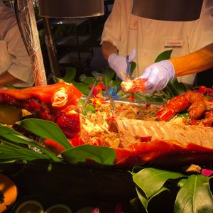 ほぼ海外の方で日本人の参加は少なくて不安でしたが、ルアウビュッフェメニューは日本語表記があったためよかったです。色々なハワイ料理を楽しめました。ウェルカムドリンクも1杯ついていて、それ以降注文する場合は別途お金がかかります。ローストビーフと豚料理は目の前で切り分けてくれました。デザートもあります。二階席でもショーはとてもよく見えましたが、ショーもビュッフェもVIP優先の順番になるため課金してもいいかなと思いました。ショー中は日本人の方はマスクをしていました。ものまねやフラ、ファイヤーダンスなどすごい迫力と盛り上がりで、参加してハワイを感じられてよかったです。