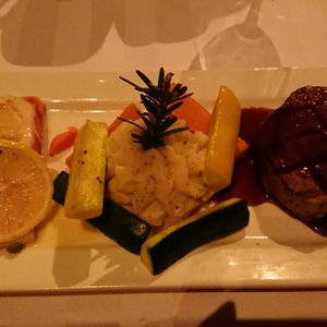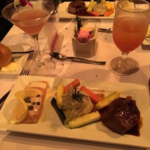 On the first day in Hawaii, I participated in a VIP course dinner. The lobster was delicious, and overall, I think the portions were quite large. I went in hungry, but I ended up feeling too full to finish the dessert. During the meal, staff came around to offer extra bread, coffee, and tea, but since I was in the middle of my steak, I thought I would have coffee afterward and declined. After that, they never returned... The coffee and tea can get cold before dessert, so I think it's a good idea to request them when they come around if you want some.