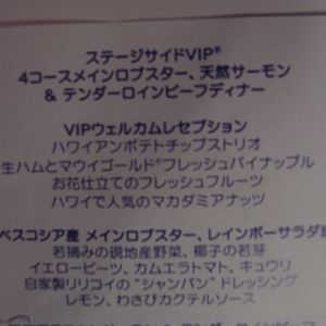 最初にスター(プレスリ役)の人との写真撮影、その後VIPウェルカムレセプションでマイタイを飲みながらおつまみをいただき、VIP専用口からステージ横の席へ、添付写真のメニューの食事開始、食事が終わったころにショーが始まりました。