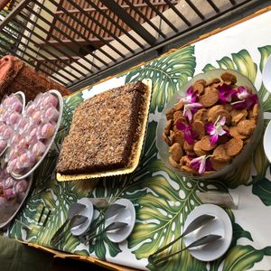 As we continued eating, desserts were served: rainbow sherbet, chocolate cake, and cookies. There was also coffee and tea. I only had the chocolate cake, but I thought it was not too sweet for Hawaii and quite tasty. The coffee was Kona coffee, which I enjoyed with the cake.