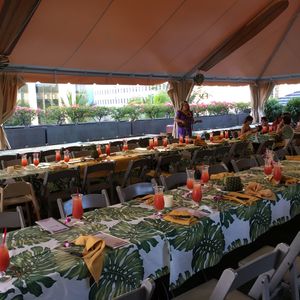 I participated with my wife on our honeymoon. It was held in the heart of Waikiki at the Royal Hawaiian Shopping Center, and we were able to make good use of our time by visiting various shops before it started. We had a buffet-style meal outdoors on the fourth floor, where a whole roasted pig was presented, which was enjoyable to see. When I mentioned to the staff that we were on our honeymoon, they kindly offered us a complimentary glass of champagne. Everyone was entertained with singing and dancing.