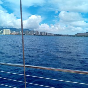 シュノーケルが終わるとペットボトルの水が渡されました。ソフトドリンク無料というのはこのことです。日焼け止めは無料で使えます。帆を上げて、しばらくワイキキ沖をクルージングし爽快な気分を味わえます。そしてアウトリガーリーフ前へ帰港となります。