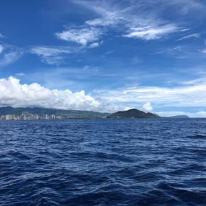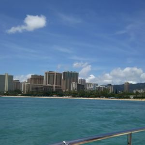 The staff doesn't speak any Japanese at all, but you can understand where the life jackets are and how to wear them through body language and nuances. The only other Japanese guests were a family with us, and everyone else was probably American, so we couldn't understand the English jokes and conversations, but since we came to Hawaii, we shouldn't expect Japanese. The waves were very calm, and it was clear until it started to get cloudy on our way back, which felt really nice. The experience of seeing the cityscape of Honolulu and the differently oriented Diamond Head from the sea is quite rare, making it a very valuable and refreshing experience. We were also lucky enough to have dolphins swimming alongside us. You can buy alcohol and soft drinks on board. There was a commemorative photo taken before departure, and you pay $15 when you return.
