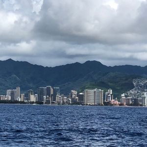 スタッフは全く日本語を話せませんが、救命胴衣がどこにあるか、どうやって着用するかの説明はボディランゲージやニュアンスでわかります。お客さんも私たちともう一組の親子だけが日本人で、あとはたぶん全員アメリカ人で、英語のジョークなど会話がわかりませんが、ハワイに来たのだから日本語に期待してはいけないのです。とても穏やかな波で、帰り際に曇ってくるまでは快晴で、とても気持ちが良かったです。海からホノルルの街並みや向きの違うダイヤモンドヘッドが見られる体験はなかなかできないので、とても貴重で、また爽快な体験でした。イルカが並走するという幸運もありました。船内でお酒やソフトドリンクが買えます。出航前に記念撮影があり、帰ってくると$15払います。