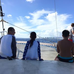 For about ten years, my mother and I have been visiting Hawaii almost every year, but this time we decided to try sailing for the first time and boarded the Mai Tai Catamaran, which departs near our hotel. I used to stay at the Sheraton, so I often saw it, but I never thought to ride it... For some reason, I was curious this time and decided to give it a try, and it was so much fun! I wish I had done this every year. As mentioned in other reviews, there were very few Japanese people on board. Besides us, there was only one couple, and the rest were from various countries, which made it even more enjoyable. The atmosphere was lively! My mother doesn't speak English, but she had a great time getting wet and laughing with someone from another country who was sitting across from us, using gestures to communicate. It was refreshing to look at the city of Waikiki and Diamond Head from the sea and feel the ocean breeze. We also saw sea turtles. The duration of the trip was just right. I read in other reviews that it was good to bring less luggage, so I tried to minimize what I brought. Before boarding, they took our picture, which we could purchase on the way back for $20. Unfortunately, I didn't have the money to buy it, and that's the only regret I have.