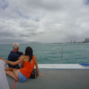 今回、ハワイの青い海をもっともっと身近に感じたい。そして満喫したいという思いから私と彼女の二人でアウトリガー・ カタマラン号のプランに参加しました。初めはお互い不安もありましたがその不安も海に出れば一瞬にして消え去りました。一言でいうと大満足でした。ワイキキビ−チから出発して海、景色ともに素晴らしかったからです。天候にも恵まれ暖かい日差しと気持ちのいい風を二人で浴びながらあっという間の時間でした。