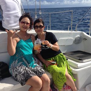 フラの仲間8人、全員60代でも気持ちは若い私達、結構揺れて前方のネットの上で波を楽しんだり、写真撮ったり。ダイヤモンドヘッドの沖合いまでセーリング。イルカや亀も見えました!日本人は私達だけでした。受付も記念写真も素早かったしヨットの雰囲気もとても良く、何回乗っても楽しいです。