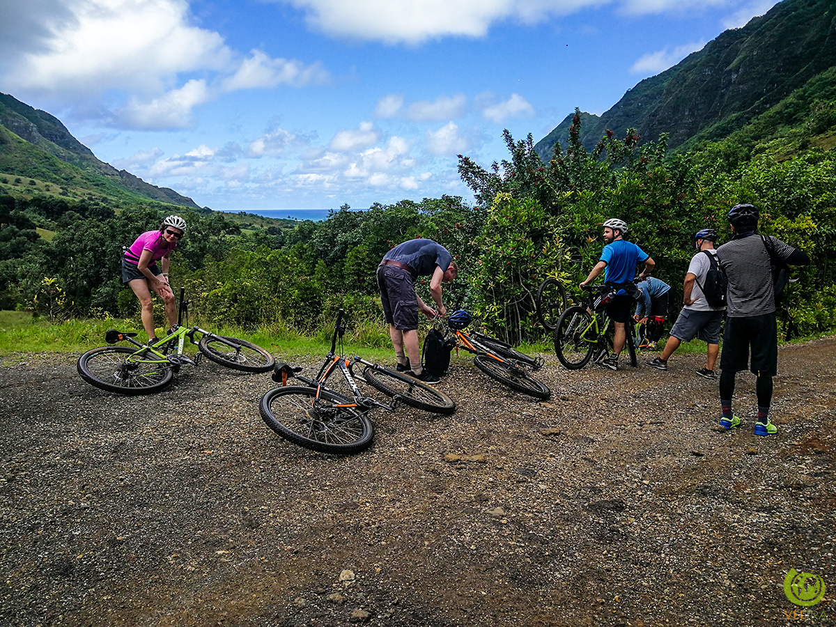 Keala even popped her rear tire at one point in the tour: she just pulled out a spare tube and swapped it out in minutes—all the while telling us more about the area, about mountain biking, or just chatting with us—and then we just kept on going.